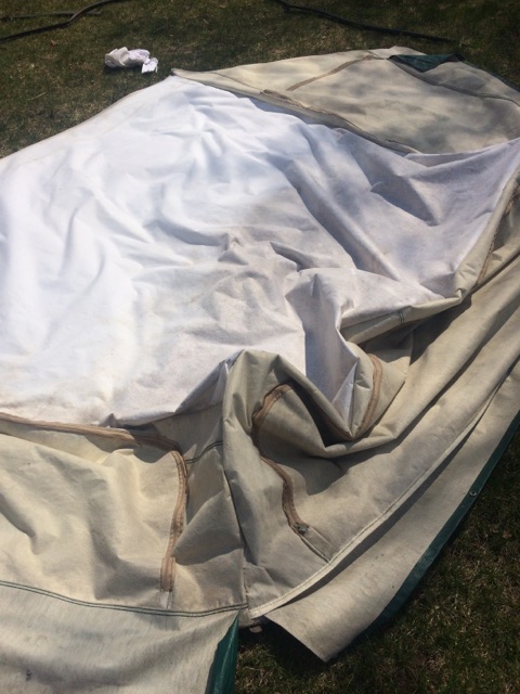 A few weeks ago we attempted to clean the canvas, and bought two different products. One was a mold cleaner from Lowes, and the other was a 3M mold/mildew boat cleaner from Gander Mountain. We had luck cleaning the outside canvas, but the inside was not budging at all.