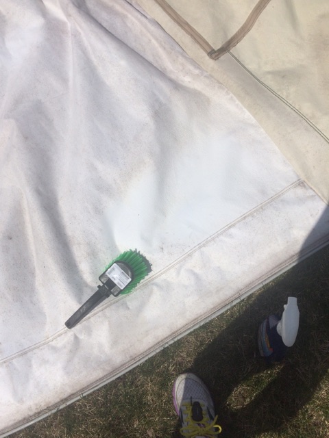 The technique I used was to spray and let it sit for 1-2 minutes, then I dipped the brush in water and scrubbed the canvas, which created some suds, but definitely showed that the tent was getting clean. Afterward, I used a wet sponge to wipe down the fabric. I’m not sure if the sponge totally cleaned out all of the spray product, but it smelled clean and bleach-like, and I’m ok with some of that being left over in the fabric.